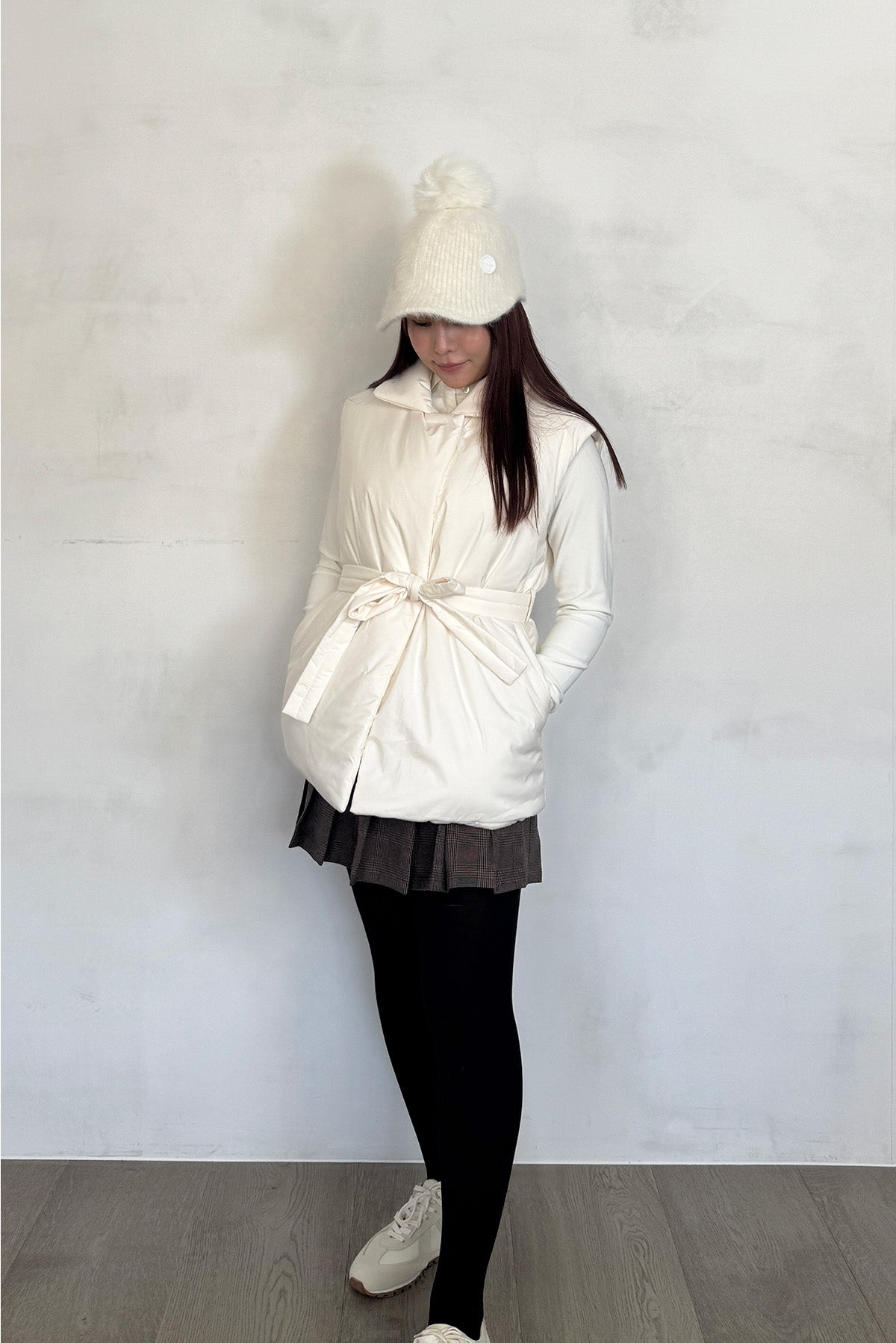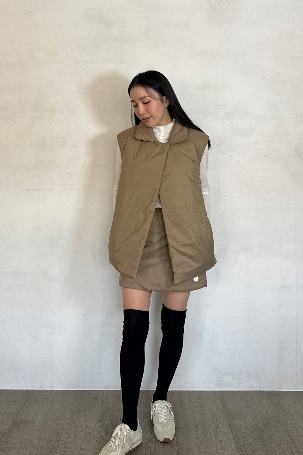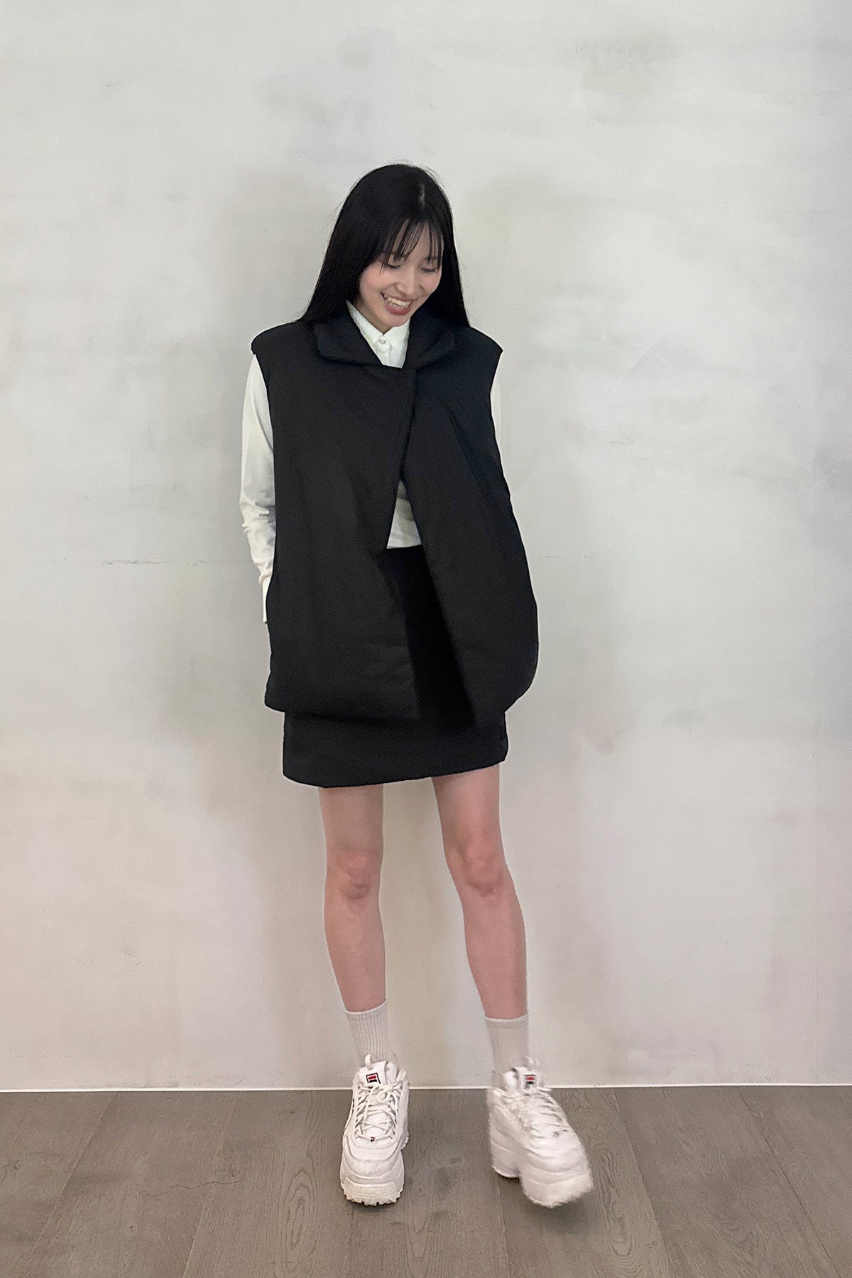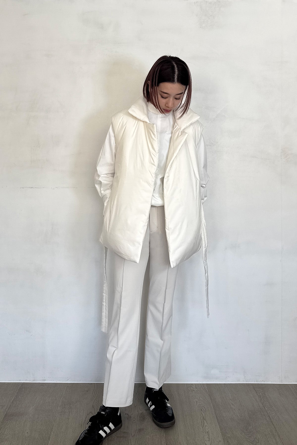 ソフトな肌触りのリサイクルポリエステル生地を使用した中綿ダウンベスト。美しい微光沢と高密度でなめらかな質感の生地がエレガントな印象を与え、スポーツシーン以外の普段のコーディネートにも取り入れ易い一着に仕上げました。両サイドには深さのあるポケット、また冬の寒さにも対応可能な軽く暖かい保温性のある中綿を全体に使用。無駄を削ぎ落としたミニマルなデザインの中に、必要な機能性はしっかりと確保致しました。お好きなインナーに合わせてコーディネートをお楽しみください。